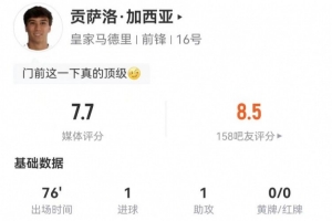 体育资讯1月12日讯 皇马在本轮西超杯对阵巴萨,贡萨洛·加西亚本场数据如下: