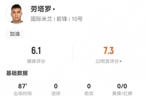 体育资讯1月12日讯 国米在本轮意甲对阵那不勒斯,劳塔罗本场数据如下: