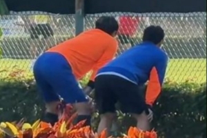 多支中超球队正在海口备战新赛季,其中包括山东泰山和青岛西海岸,一段视频显示,泰山门将王大雷在训练结束后透过围栏观看西海岸训练。