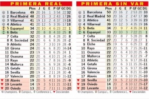 阿斯报列“如果没有VAR”西甲积分榜:巴萨+1分、皇马+2分