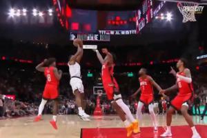 快船喊出暂停,最后一个回合包夹了一整场小卡的火箭放弃包夹,小卡翻身后仰命中并造成犯规打成2+1。
