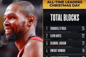 在本场比赛过后,杜兰特(16)在圣诞大战盖帽榜上升至并列第五,詹姆斯(14)上升至第八。