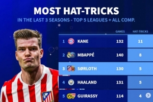 德转列出五大联赛球员最近三个赛季在各项赛事戴帽次数榜,瑟尔洛特与哈兰德5次并列第三,凯恩11次居首。