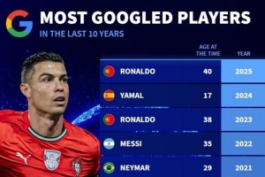 体育资讯12月27日讯 《转会市场》根据谷歌搜索列出了近10年的年度被搜索次数最多的足球运动员,C罗共计6次登顶。