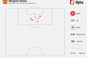 据Opta统计,阿莫林离任之后,舍什科为曼联出战6场英超比赛,打进5球,平均每37分钟打进1球。