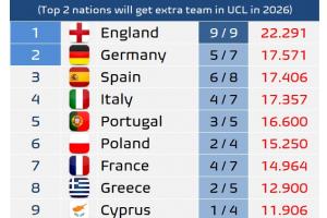 目前欧战积分中,英格兰22.291分遥遥领先,基本确定拿到新赛季5个欧冠参赛名额,德国、西班牙、意大利分列2-4位,分差不到0.3。