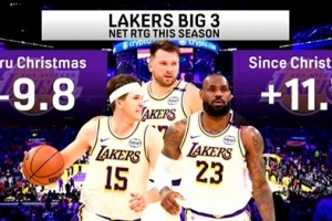 本赛季湖人三巨头同场净效值在圣诞节前-9.8 圣诞节至今+11.7