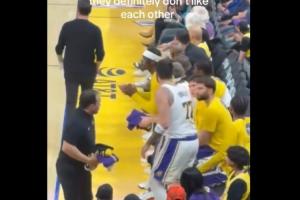 雷迪克追着东契奇到了板凳席末端,跟东契奇吵了两句就转身离开,东契奇看起来非常生气,站了起来并且想追上去找雷迪克对峙,被范德比尔特站在中间拦住,东契奇转身后,可以看到他的表情非常愤怒。