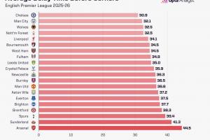 Opta统计2025/26赛季英超各队角球前平均延误时间(从少到多排序)↓